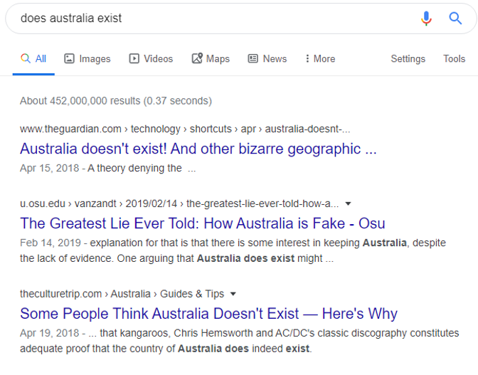 But don’t ask Google, for example, “does Australia exist” since only one result on the page gives the correct answer; Australia does, in fact, exist.